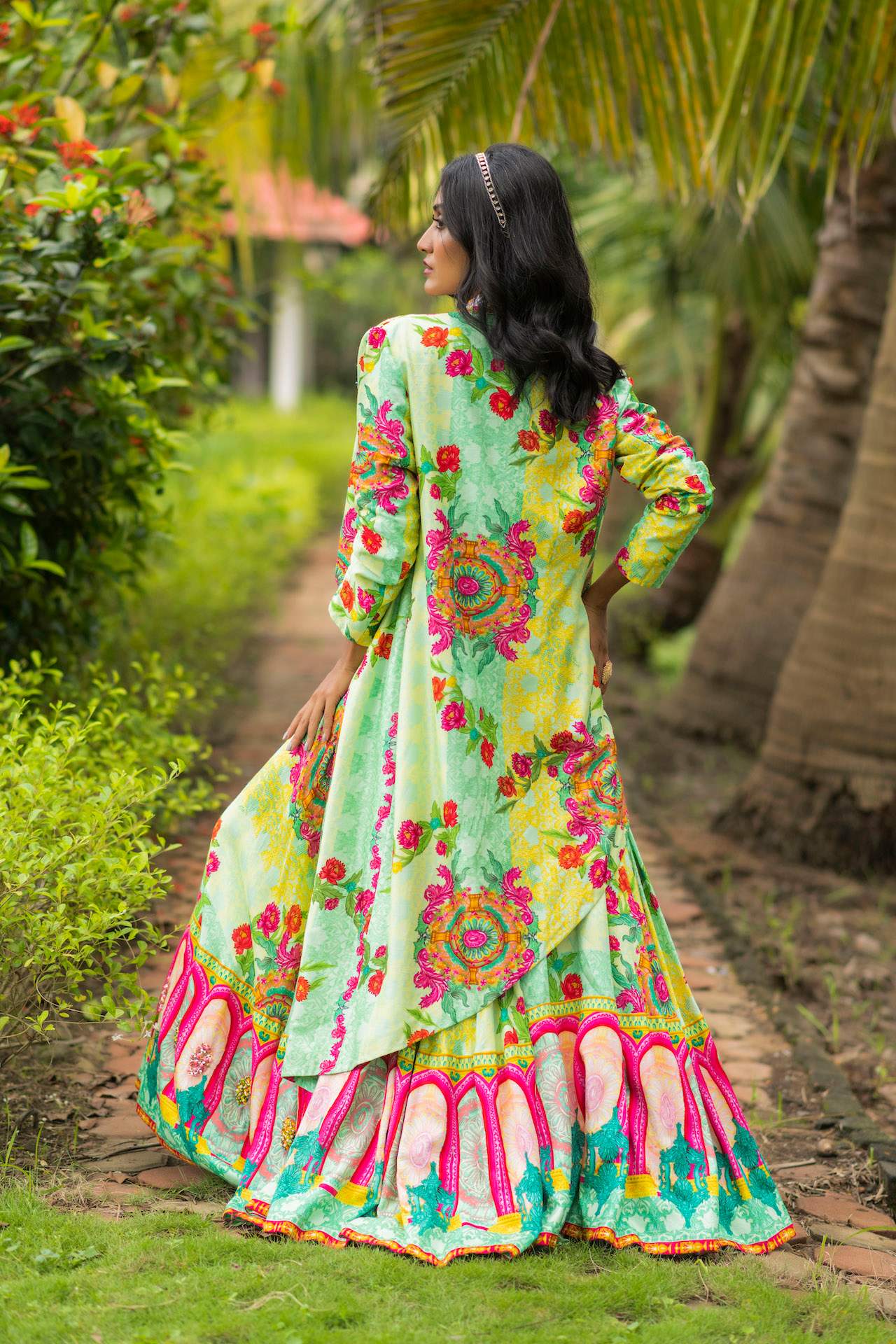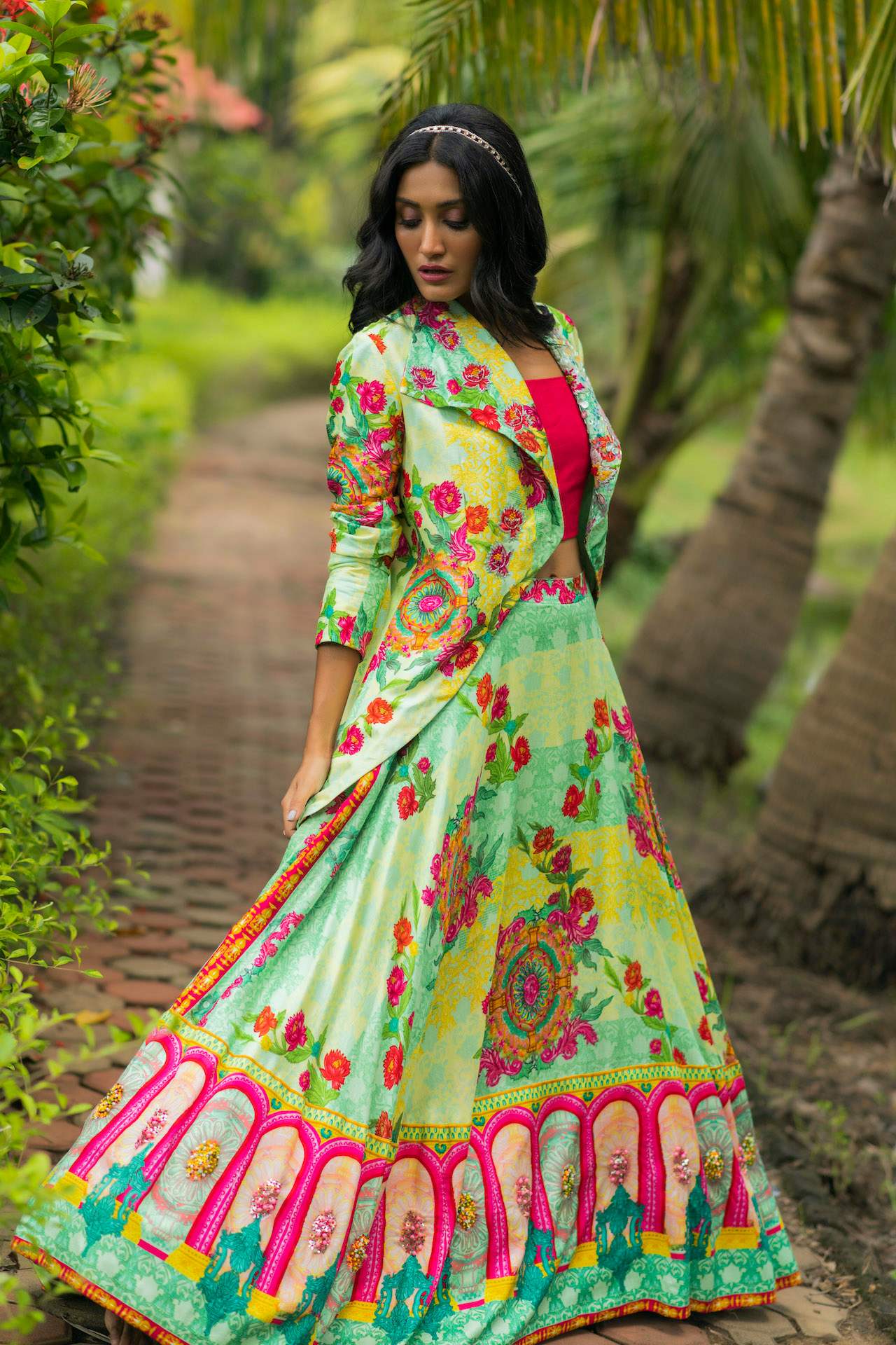 Home / Products / Printed Lehenga With Asymmetrical Jacket & Crop Top Price inclusive of all tax