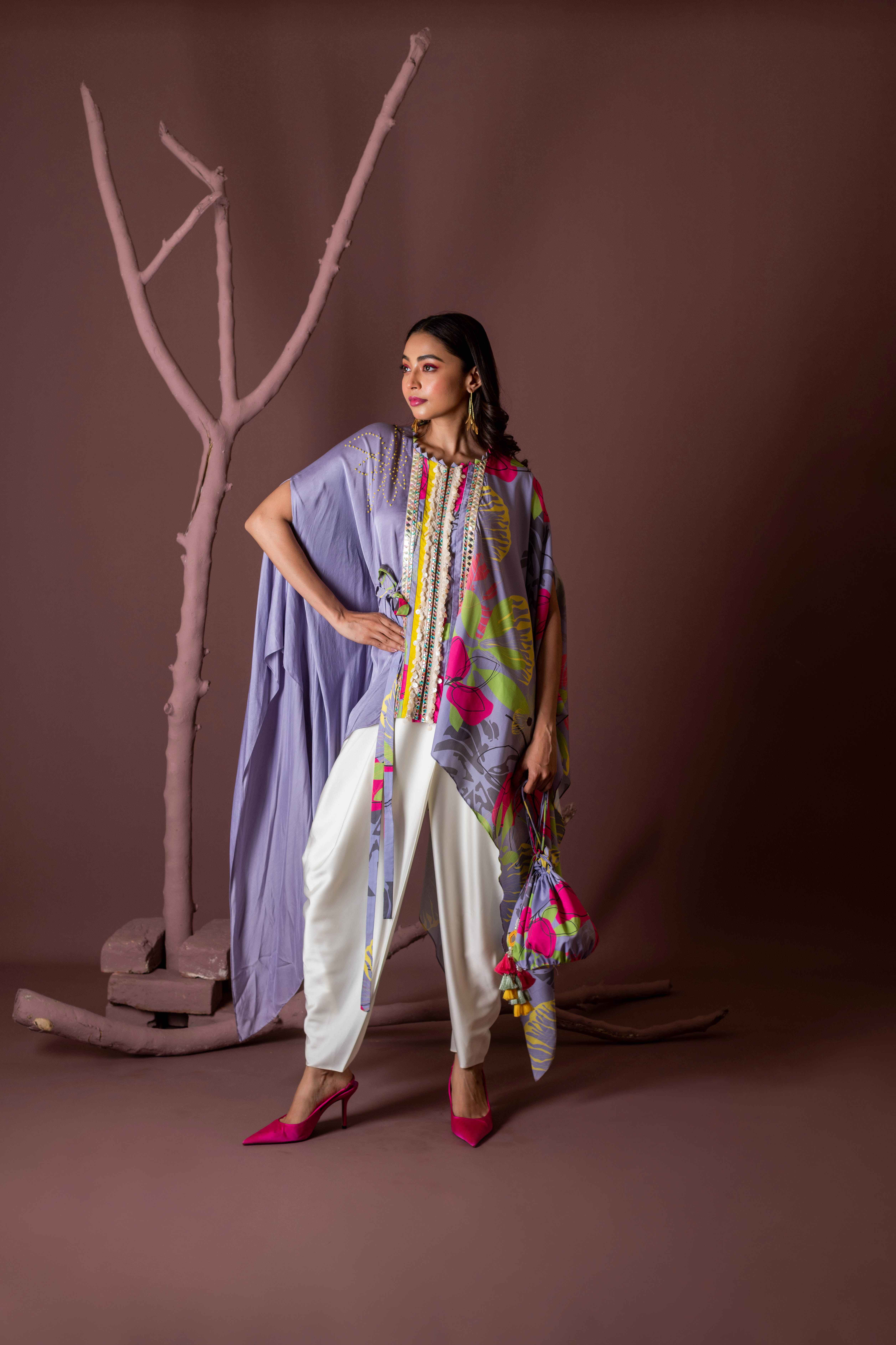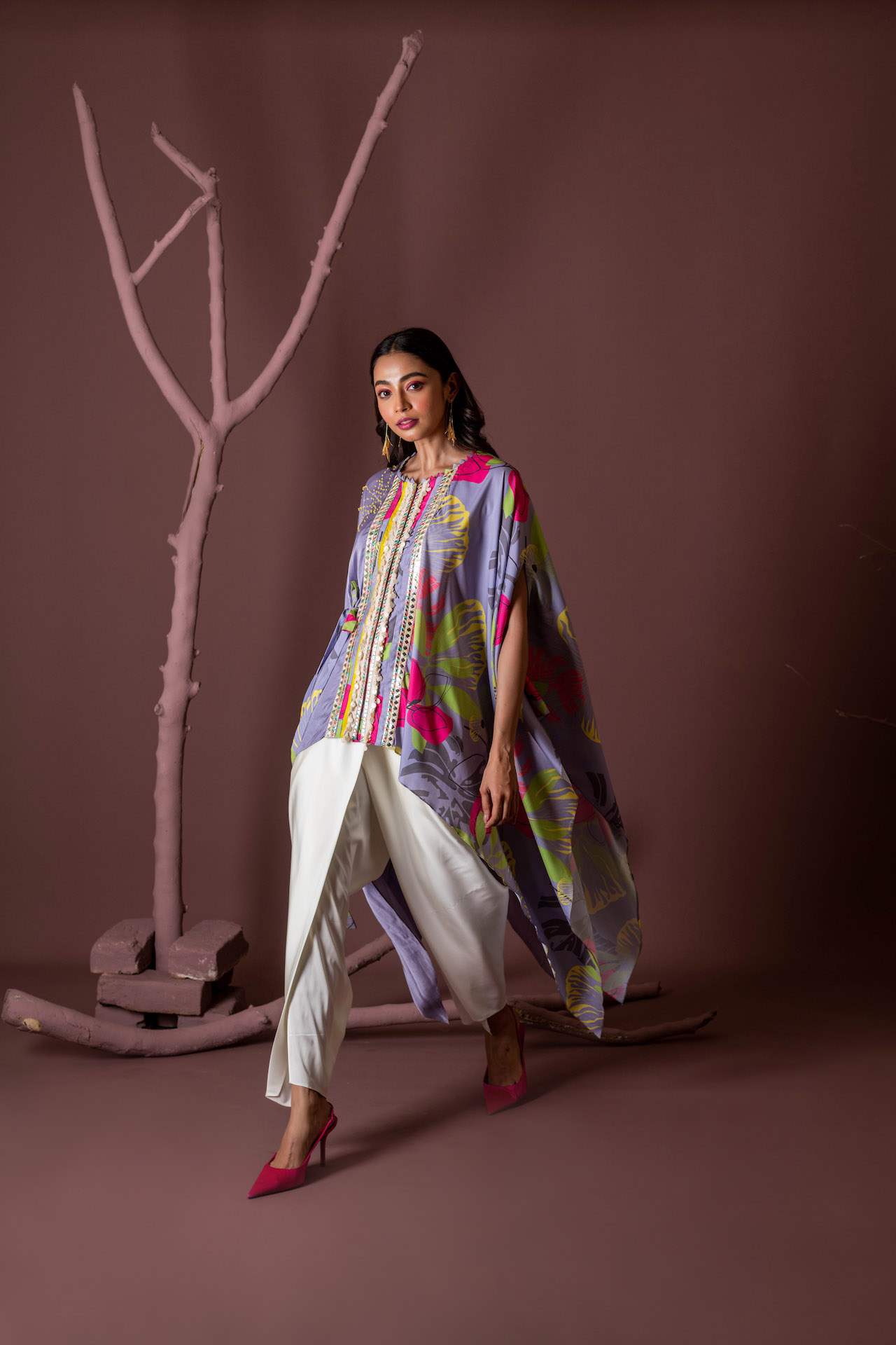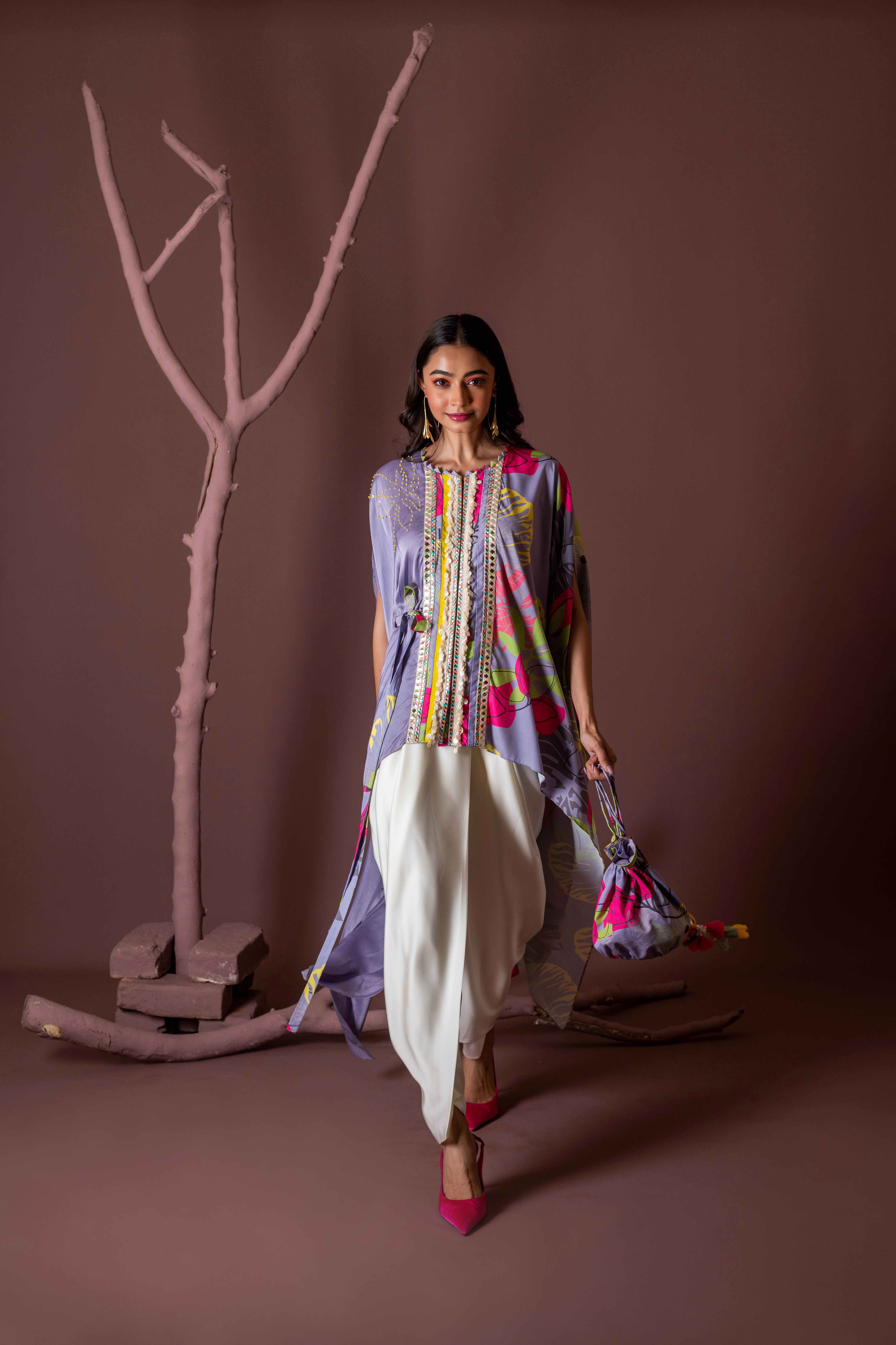 Printed Lilac Kaftaan With Off-White Dhoti Pants