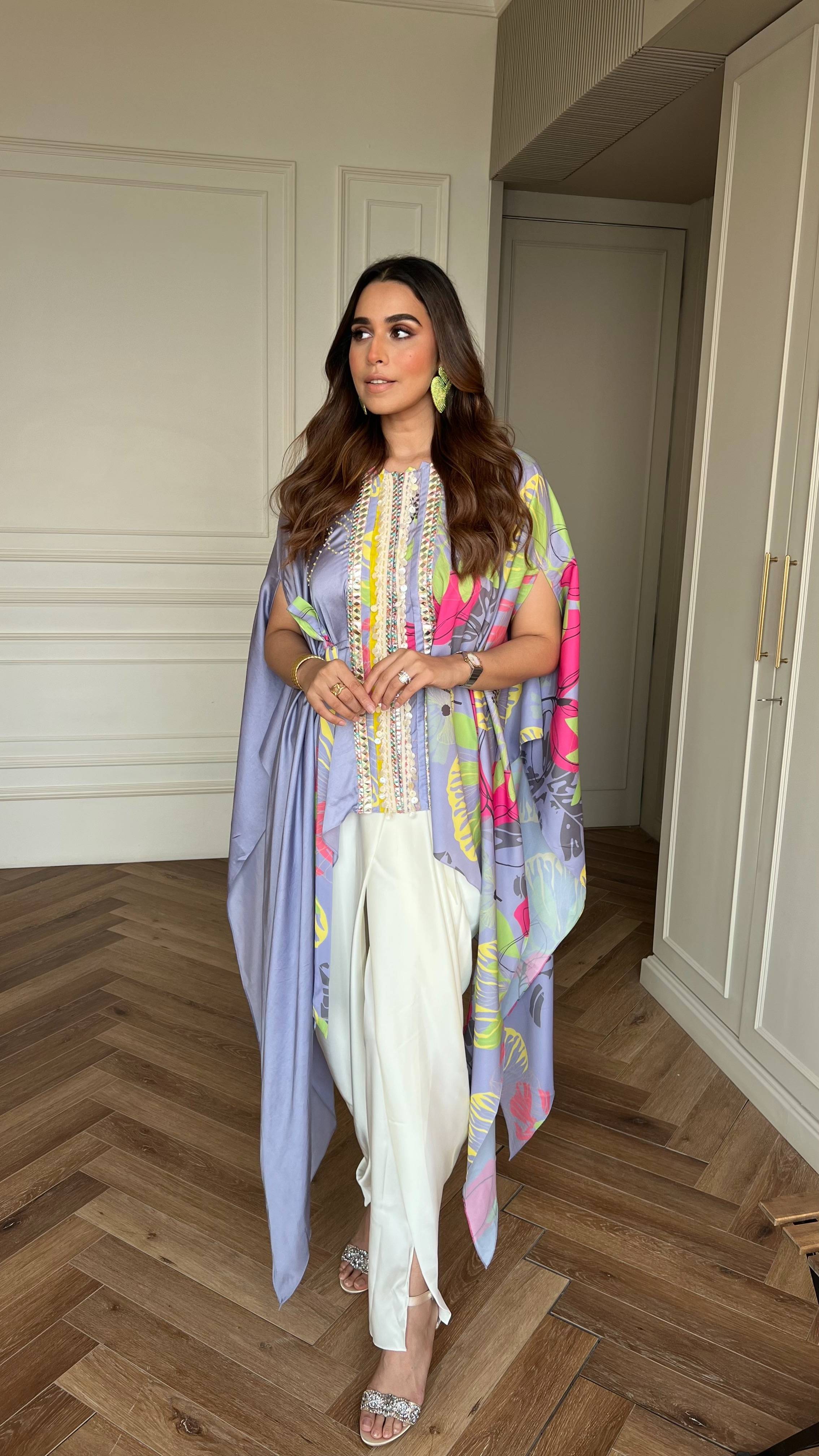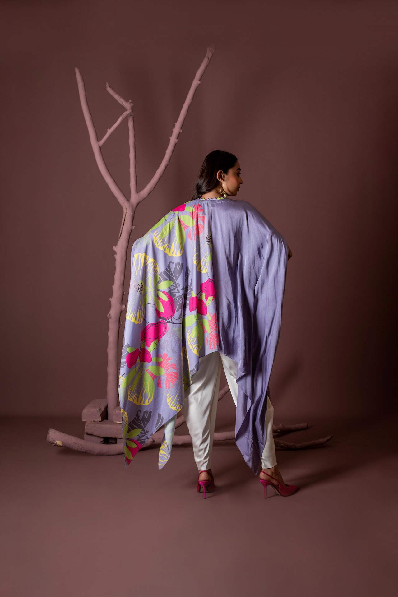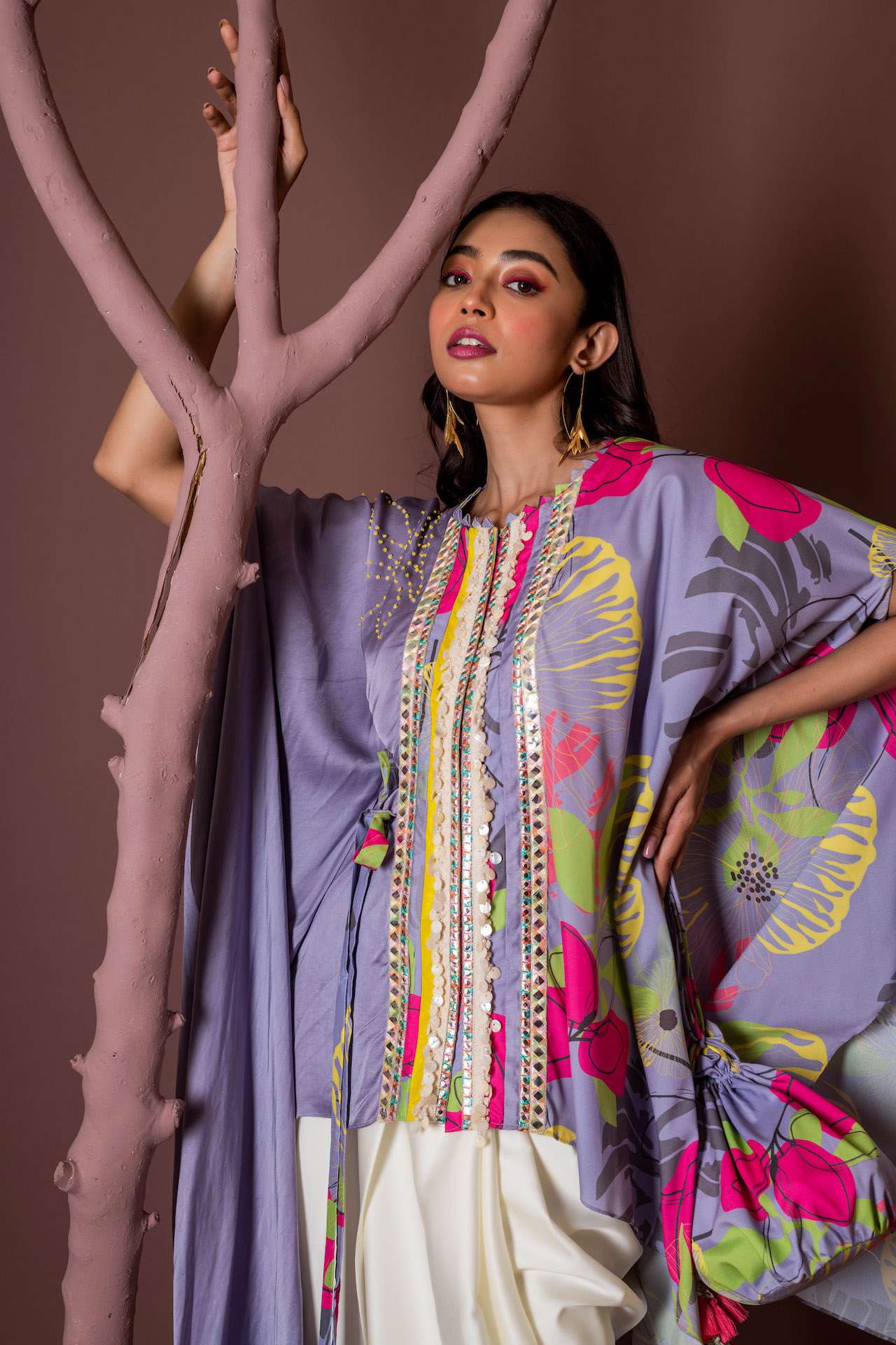 Printed Lilac Kaftaan With Off-White Dhoti Pants